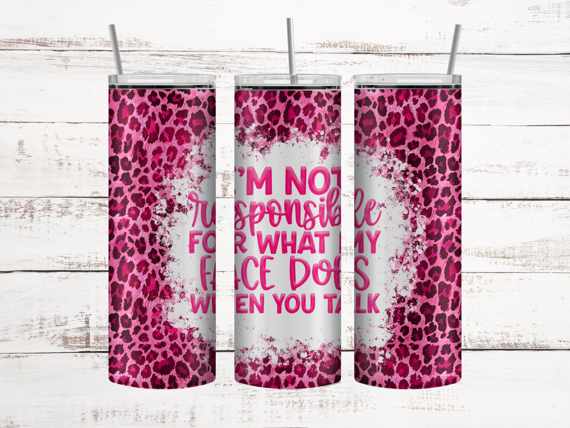 "I'm not responsible for what my face does when you talk" 20 oz tumbler. This tumbler will keep your beverages hot for up to 12 hours and cold for up to 12 hours. Also included is a metal straw and a cleaning brush.